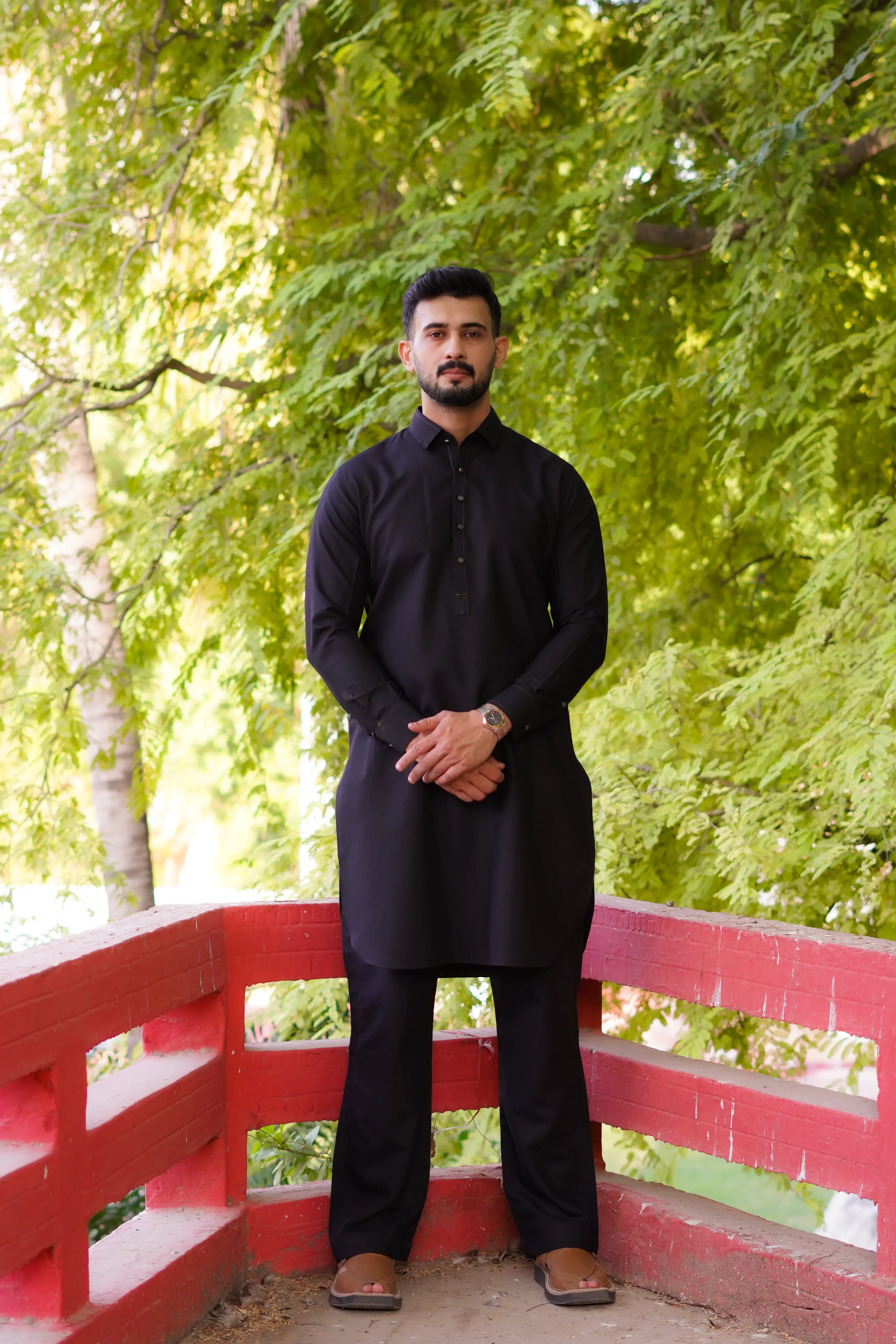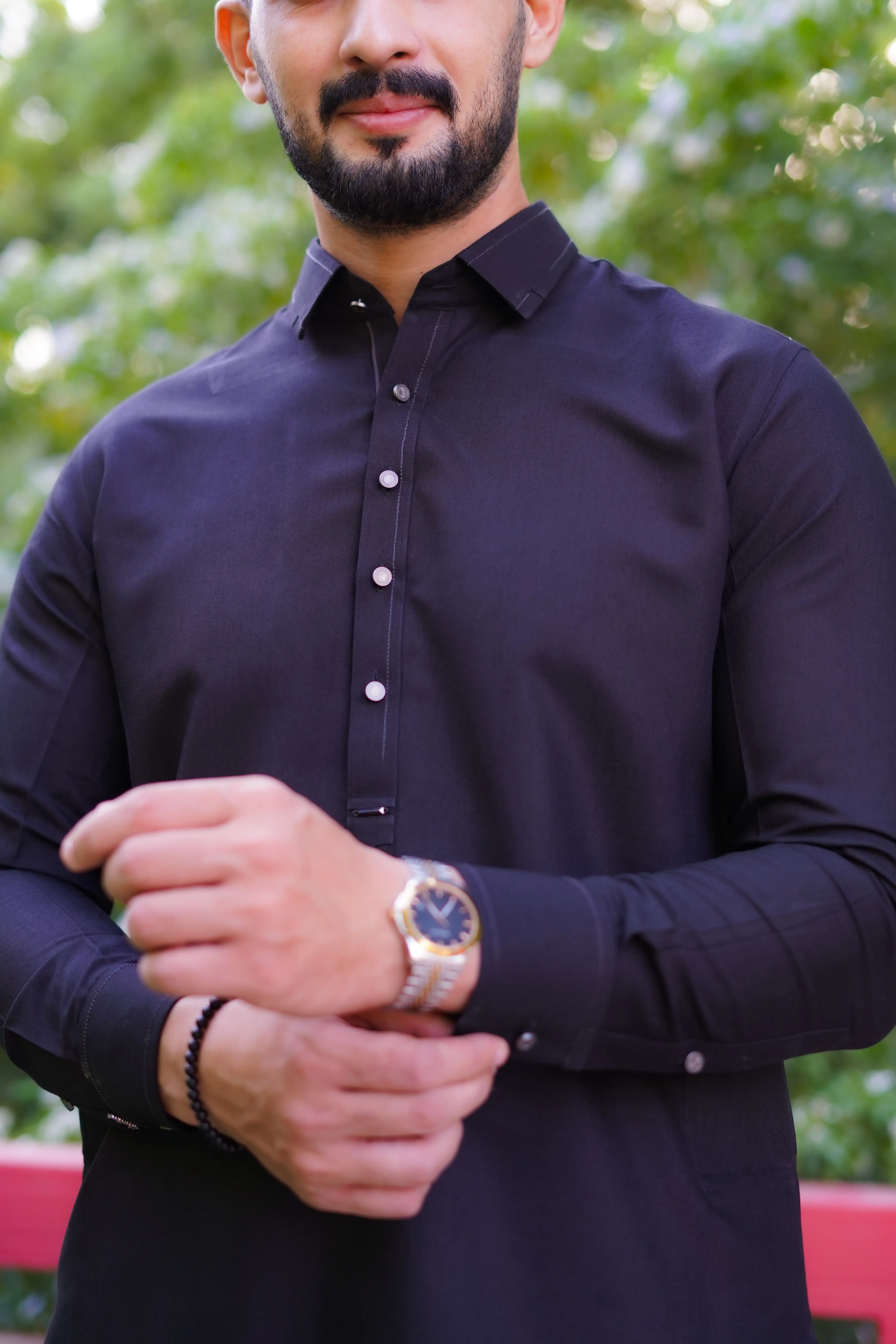 Designed for the modern gentleman, this outfit showcases Gun Metal premium accessories and Grey metal buttons, adding a subtle touch of luxury to its deep black finish. The straight cut kameez with refined stitching complements the farshi style shalwar, offering an effortlessly graceful fall and a contemporary yet traditional look.