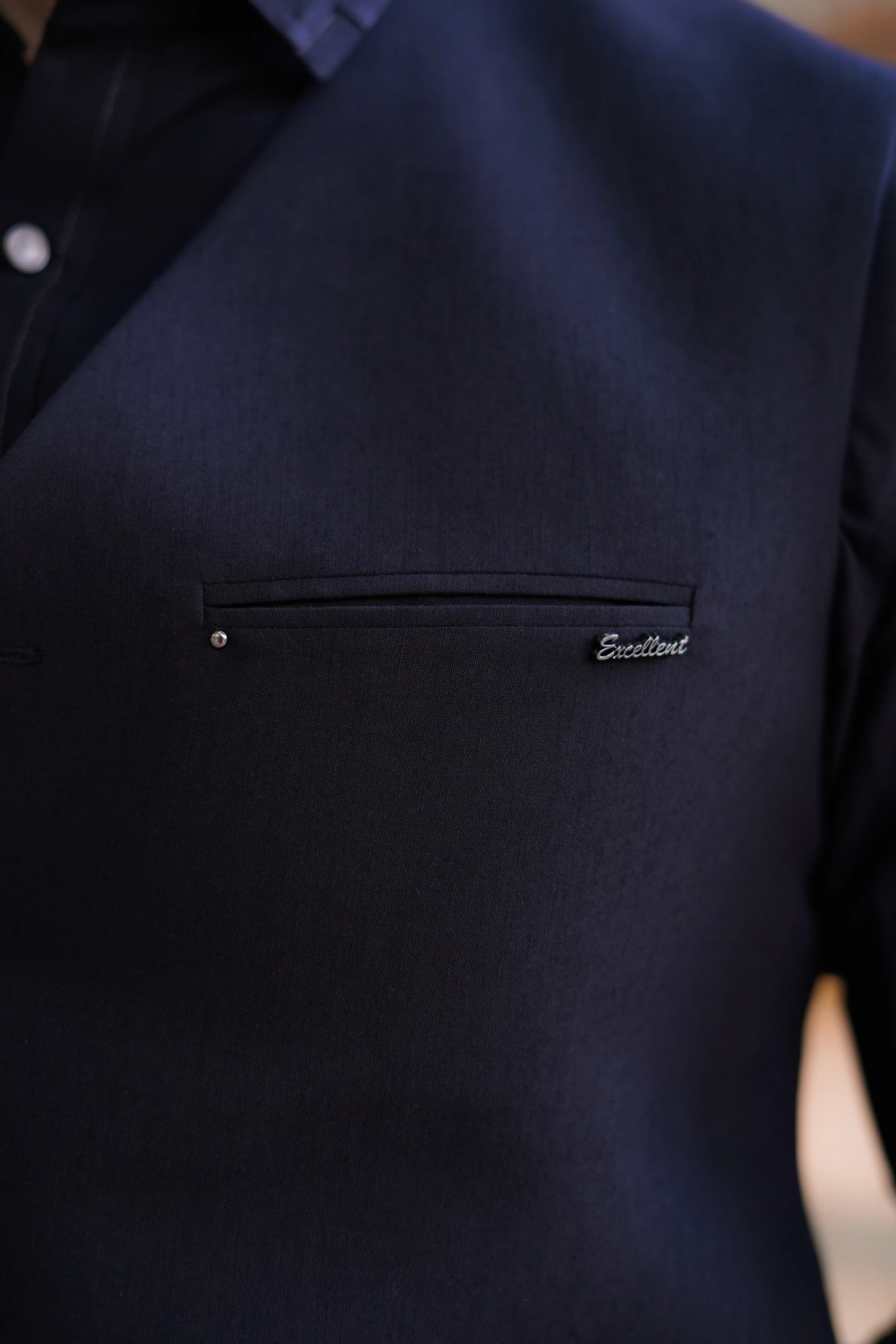 The front is adorned with premium metallic buttons, paired with a sleek Excellent branded metal tag on the chest pocket for added identity and sophistication. With its bold dark tone and minimalistic premium hardware, this waistcoat is perfect for weddings, evening gatherings, and traditional occasions, delivering a strong confident presence.