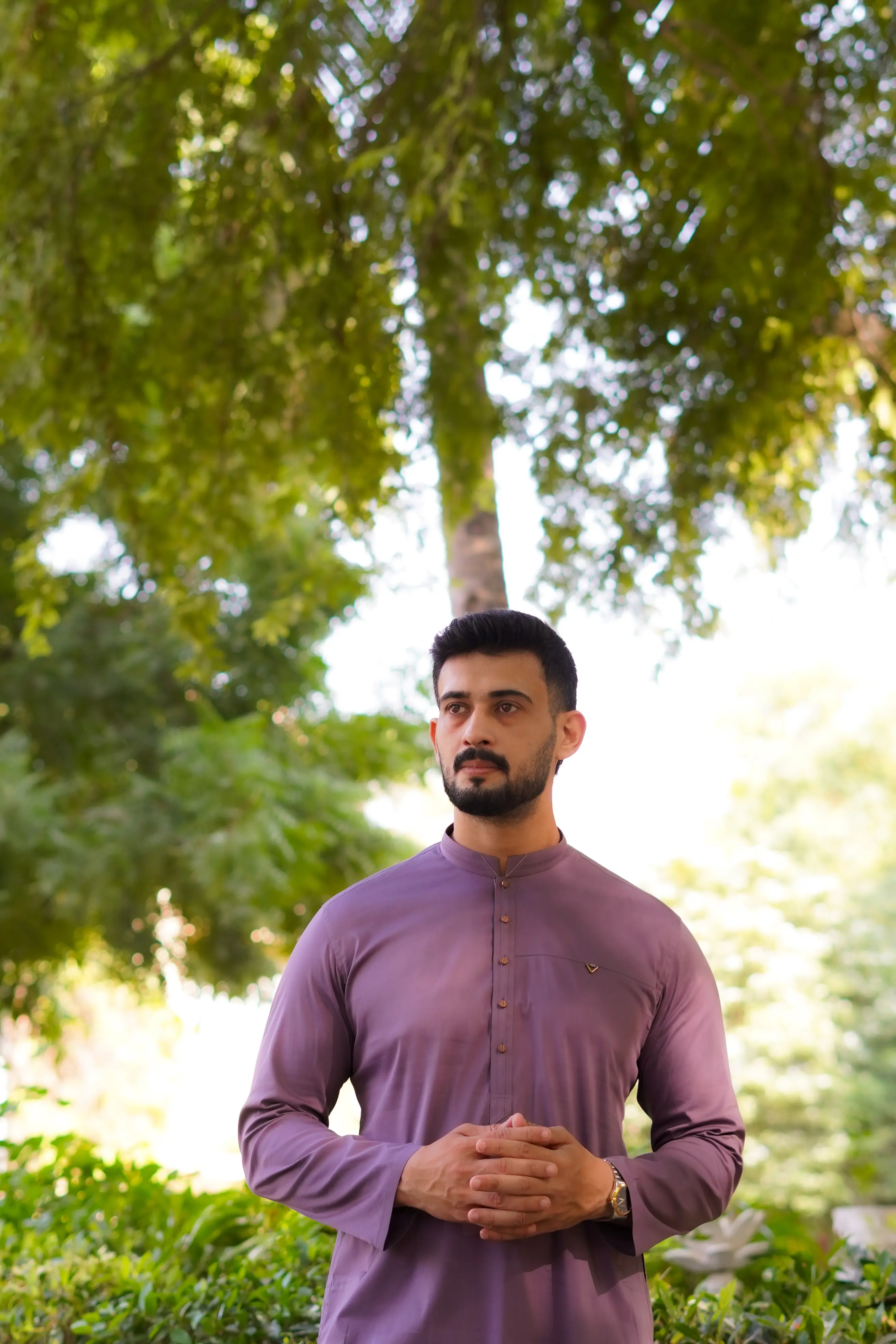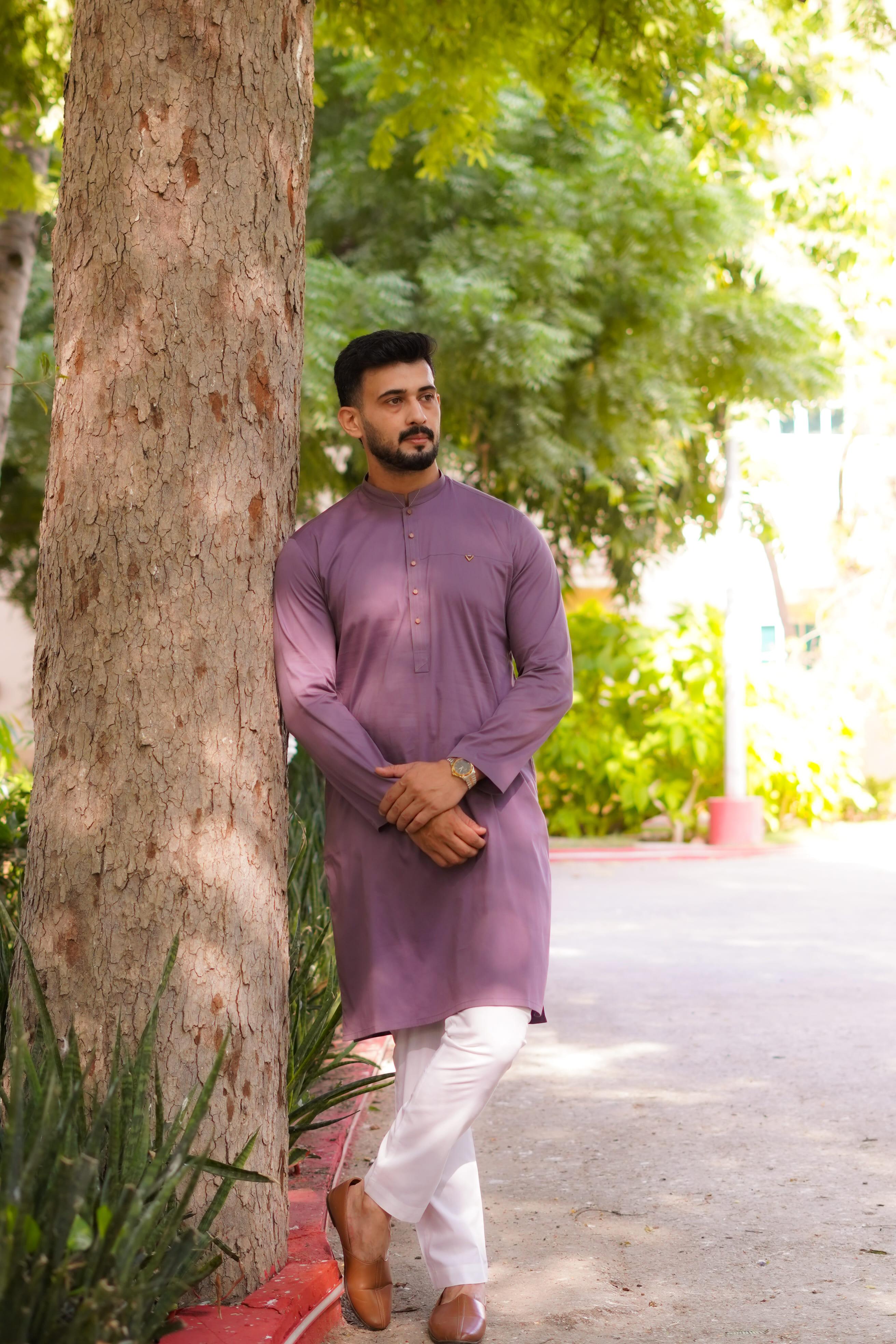 Kurta PajamaA refined light purple kurta pajama crafted in soft Egyptian cotton. The smooth breathable fabric delivers effortless comfort while maintaining a polished structure. The design features subtle contrast detailing along the front with brass metal buttons that enhance the elegant pastel tone. Ideal for daytime gatherings, casual events and summer wear with a contemporary yet traditional finish.