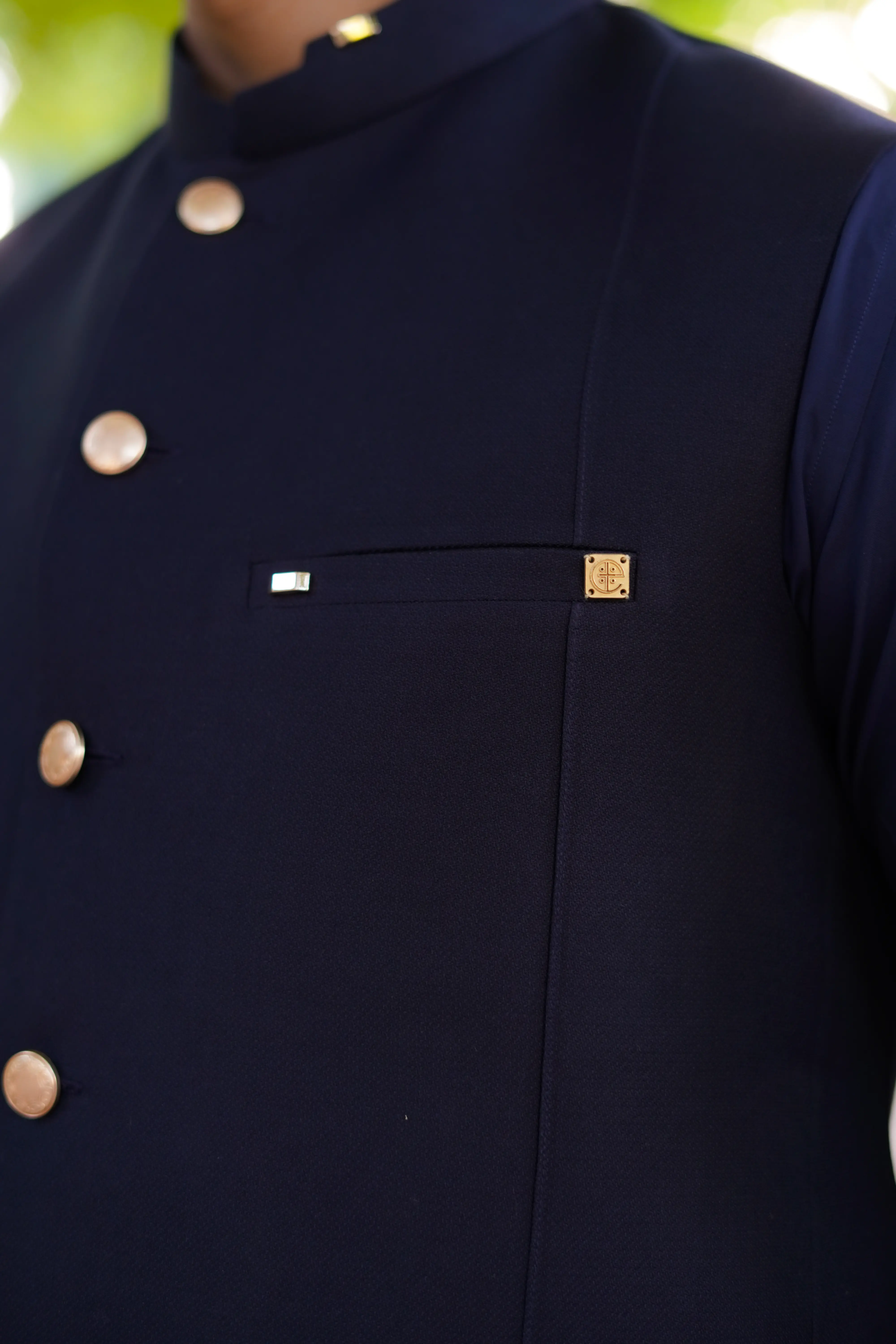 WaistcoatsThis navy blue waistcoat is designed for a clean structured look with a modern premium touch. The smooth fabric gives a refined formal finish while maintaining comfort and balance. The front features rich golden metal buttons that stand out beautifully against the deep blue base creating a polished luxurious appeal. Signature detailing includes a gold emblem accessory on the pocket adding a distinct identity to the overall design.